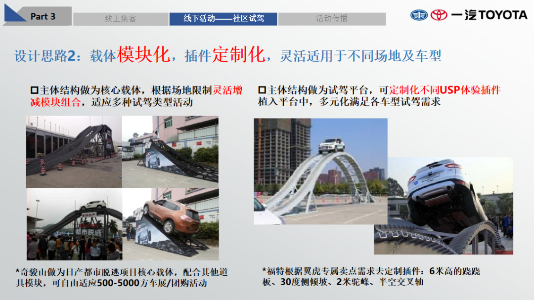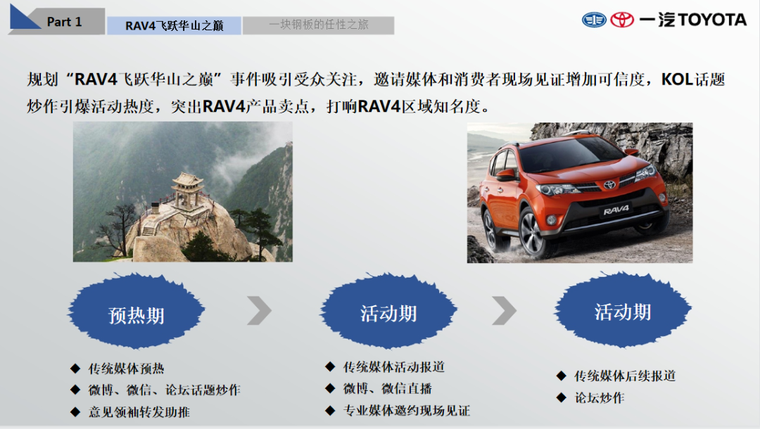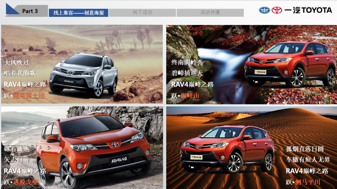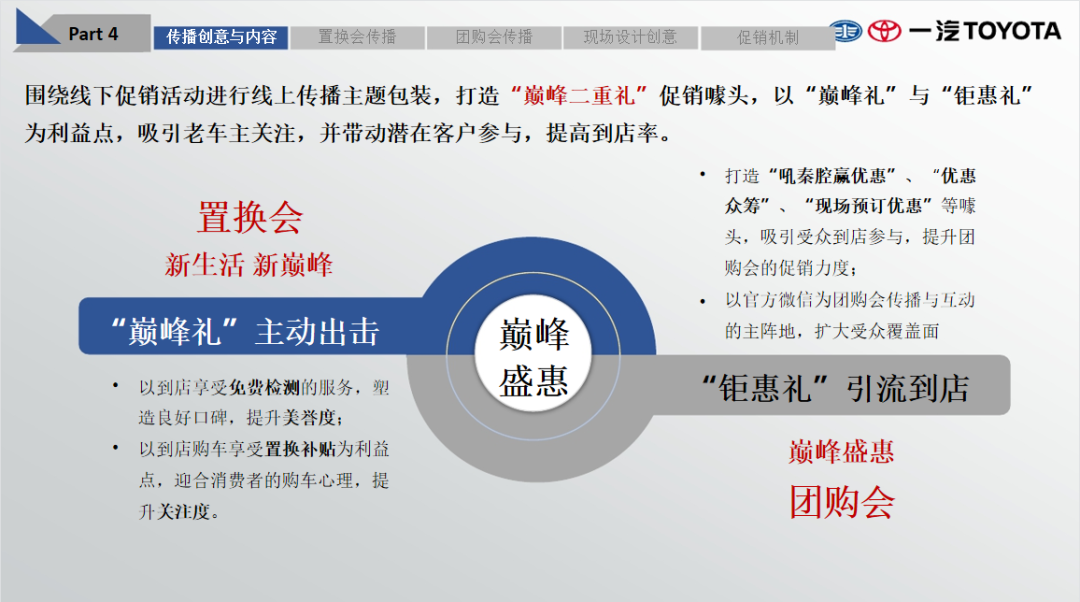 本项目由区域营销理解、项目概况、营销策略、区域营销KPI及服务保障五部分组成,通过对市场、竞品、消费者的分析以及区域特点,推导出一汽丰田品牌价值及策略,围绕跃 巅峰主题开展营销传播,线上借助双微一抖+KOL+媒体矩阵进行话题造势,吸引消费群体参与,线下借助试驾体验+团购会的方式,进行二次传播的同时刺激消费。