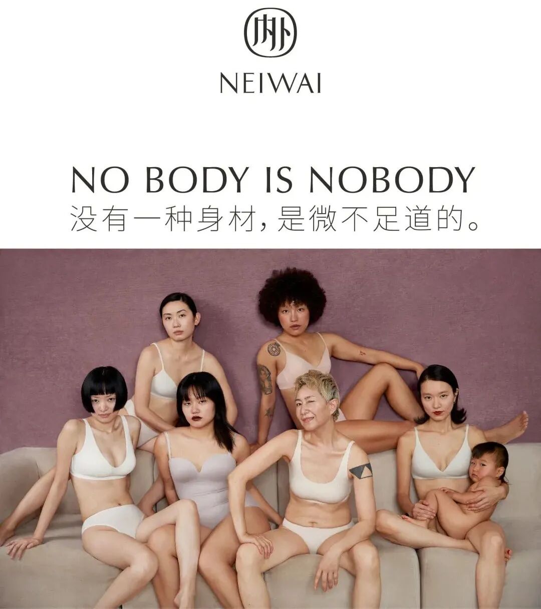 2020年2月,内衣品牌NEIWAI内外NO BODY IS NOBODY项目正式开启,意为没有一种身材,是微不足道的,表达品牌对真实与多元之美的态度,并在接下来的4个月中持续产出内容,引发网友共鸣而获得广泛传播。